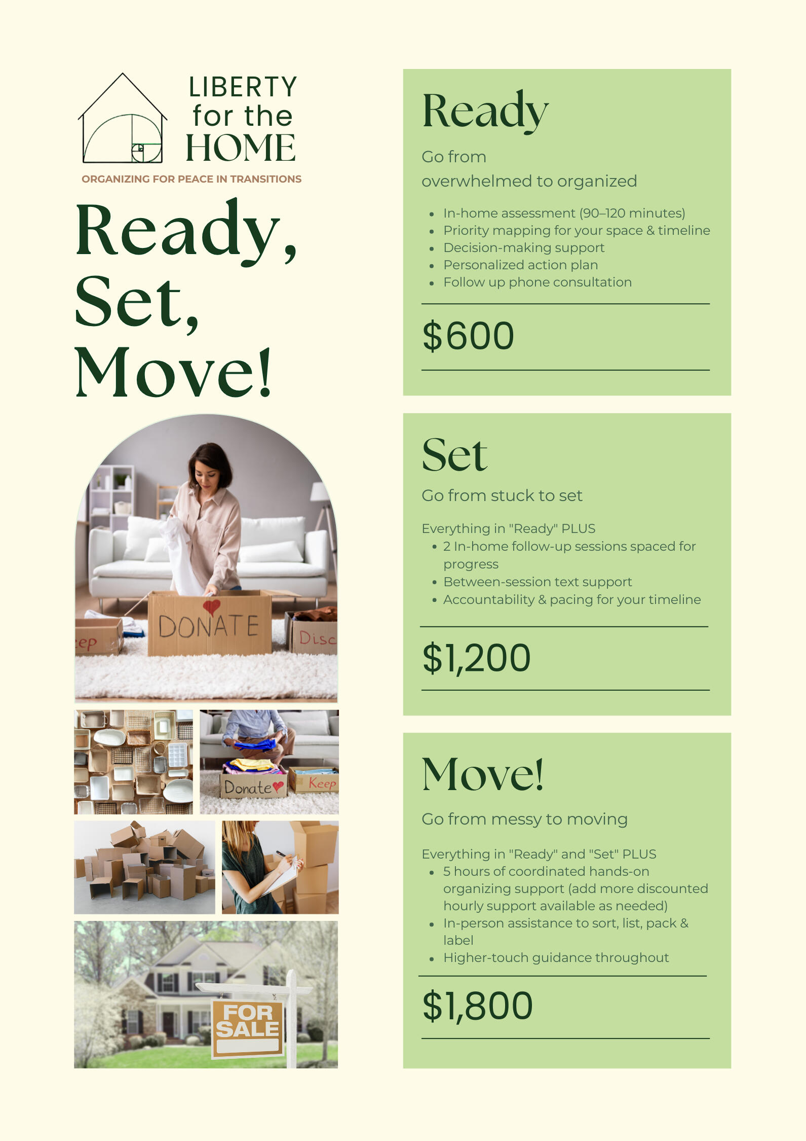 With your vision and goals in mind, we co-create an action plan for selling, donating, pitching, organizing or packing.Moving to a house with a sunny breakfast nook and a coffee corner? Let's dig those things out of the basement bar and pack them with the kitchen stuff for your new home.